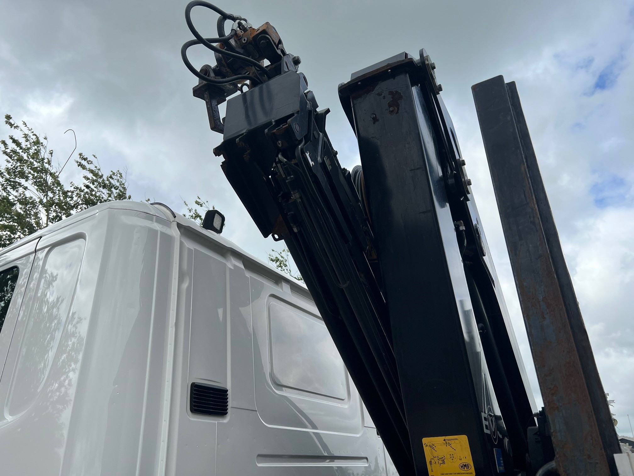 Fin 1-ejers kranvogn - Euro 6 miljøzone godkendt - med 6,20 m lad med hydr. udtrækskofanger så bagsmækken kan forlænge ladet - frontmonteret HMF 1720 K4 kran med hydr. rækkevide 12,7 m, med olie ført ud med tilhørende rotator, med radiostyring. Opticruse aut. gear, fuld luft, kamera, oliefyr, klima, køleskab m.v.