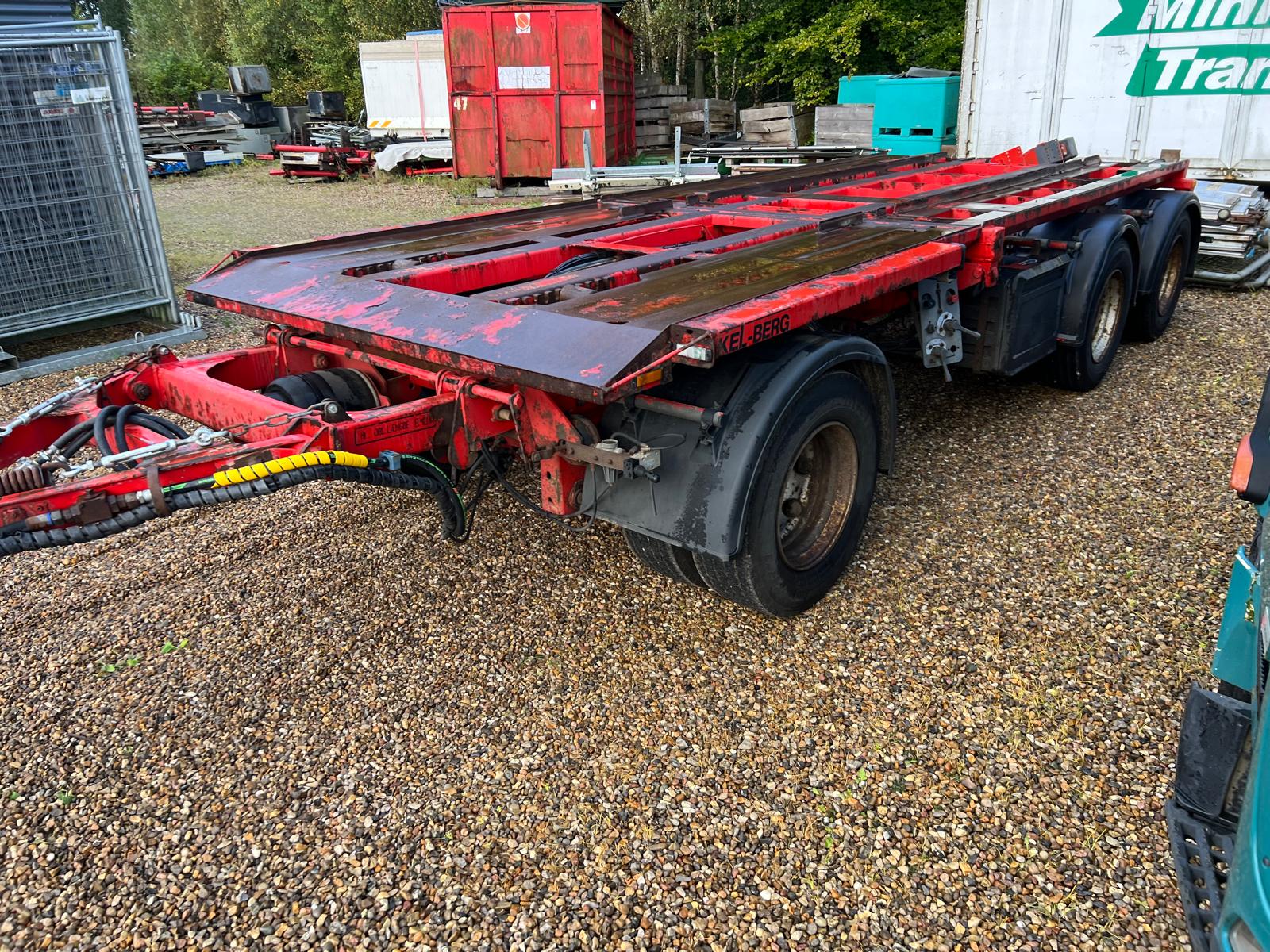 Kel-Berg overførselsanhænger med 3-vejs tip og plads til containere i størrelsen 6,0–6,5 meter. Anhængeren er udstyret med udvendige containerlåse og forskydelig trækstang.