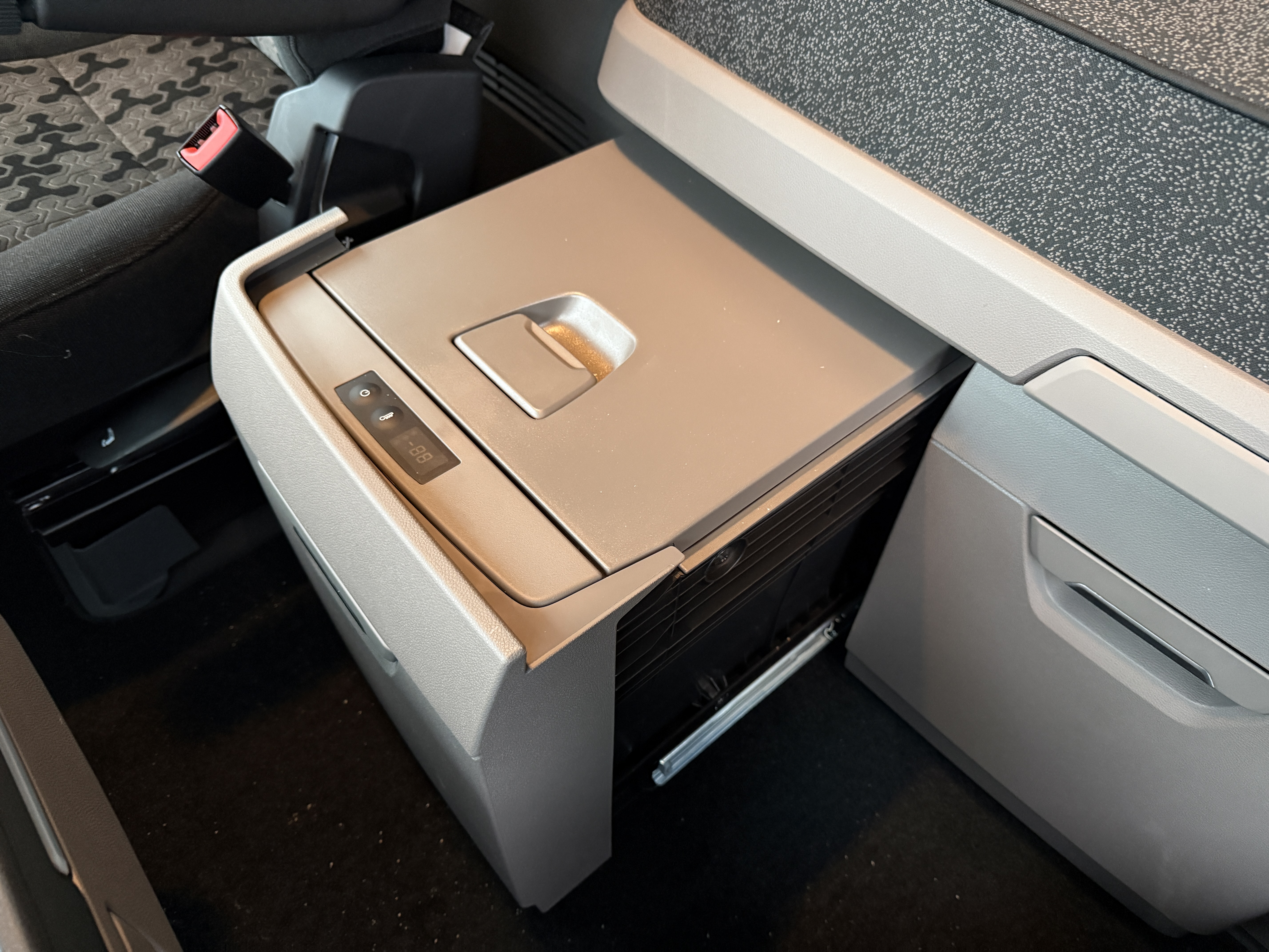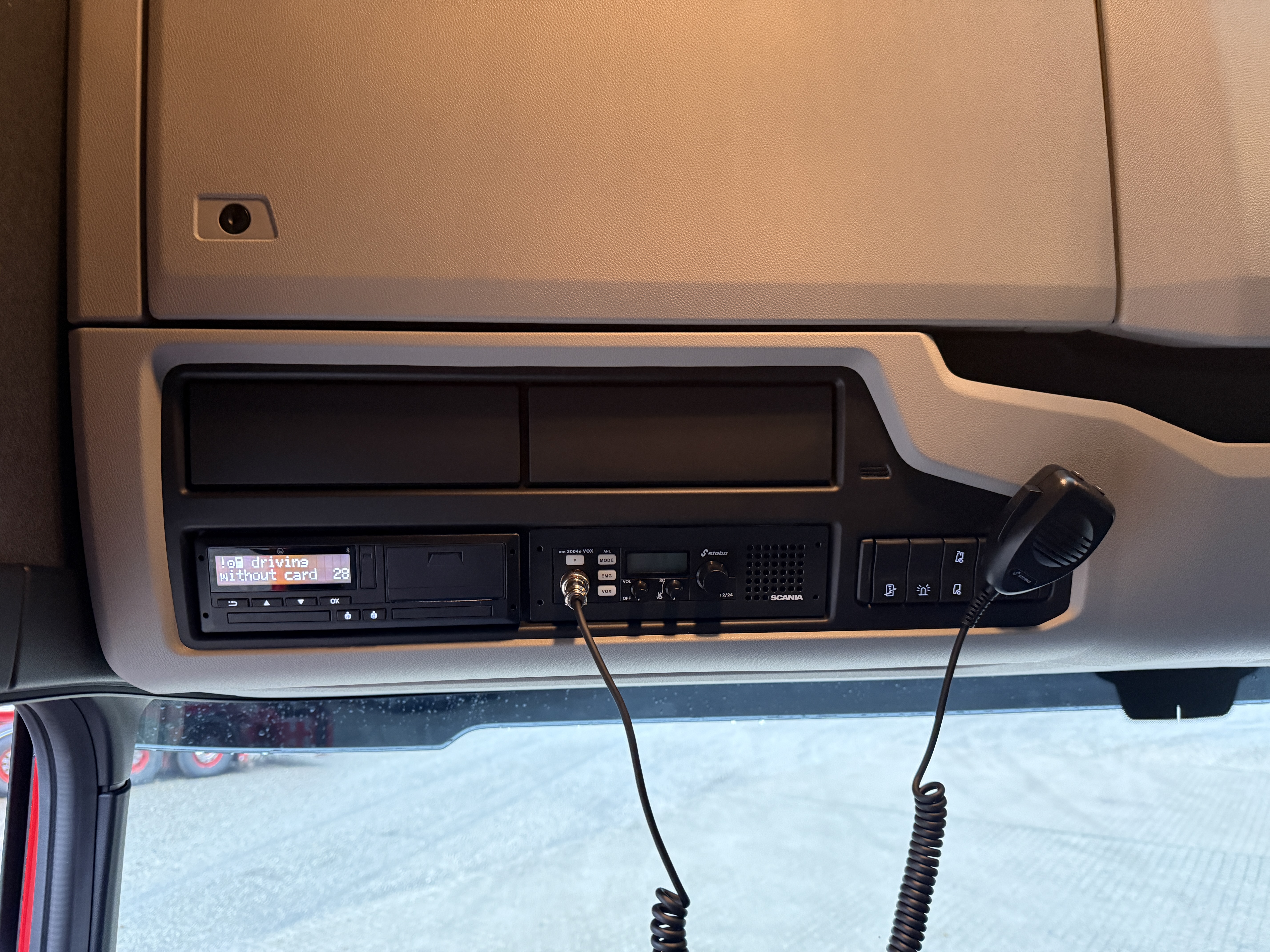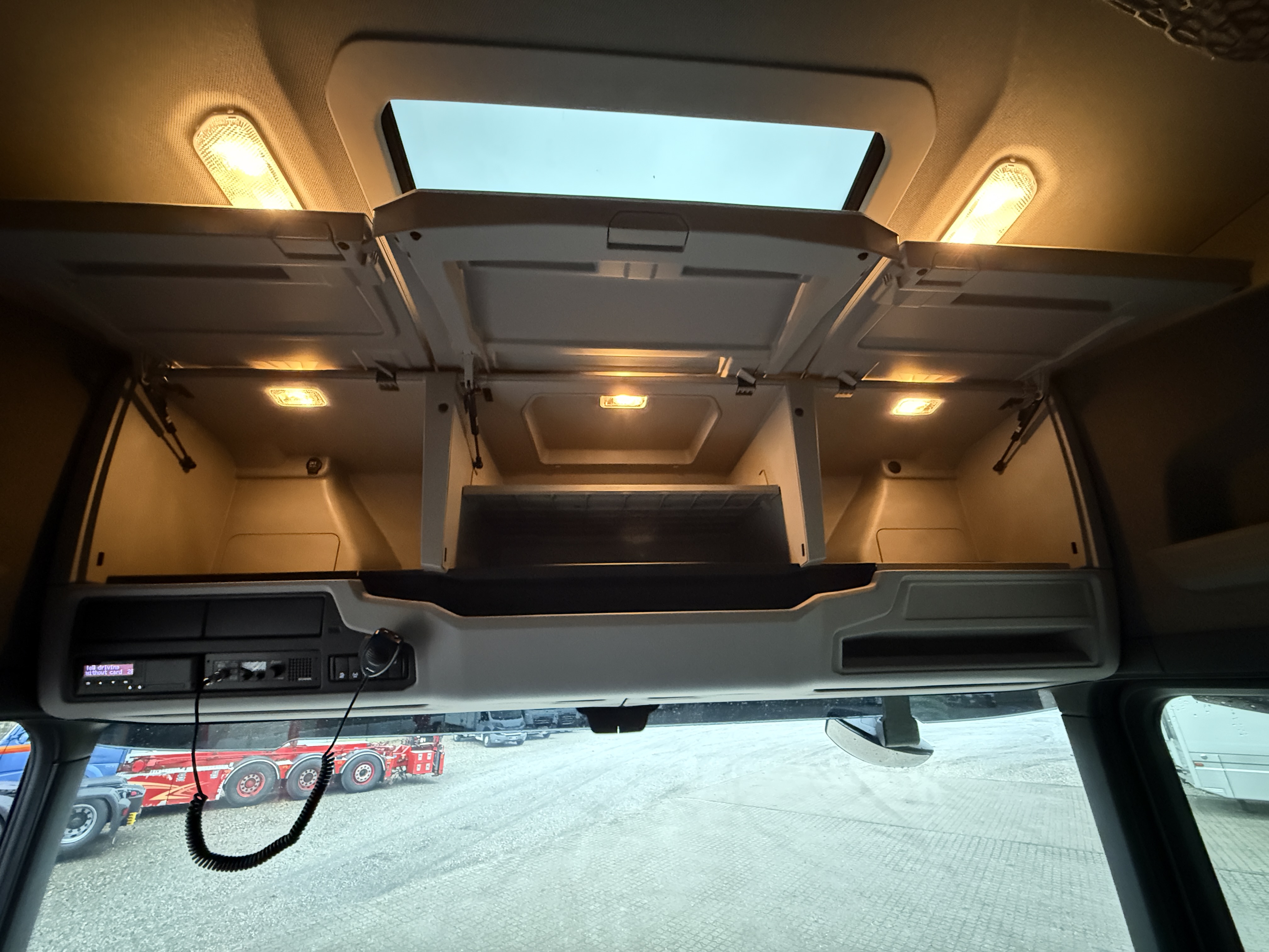 Kabinen er godt udstyret med navigation, Apple CarPlay, aircondition og Scania Air Cooler. Førersædet har både varme og ventilation, og der er installeret bakkamera, radio og walkie.