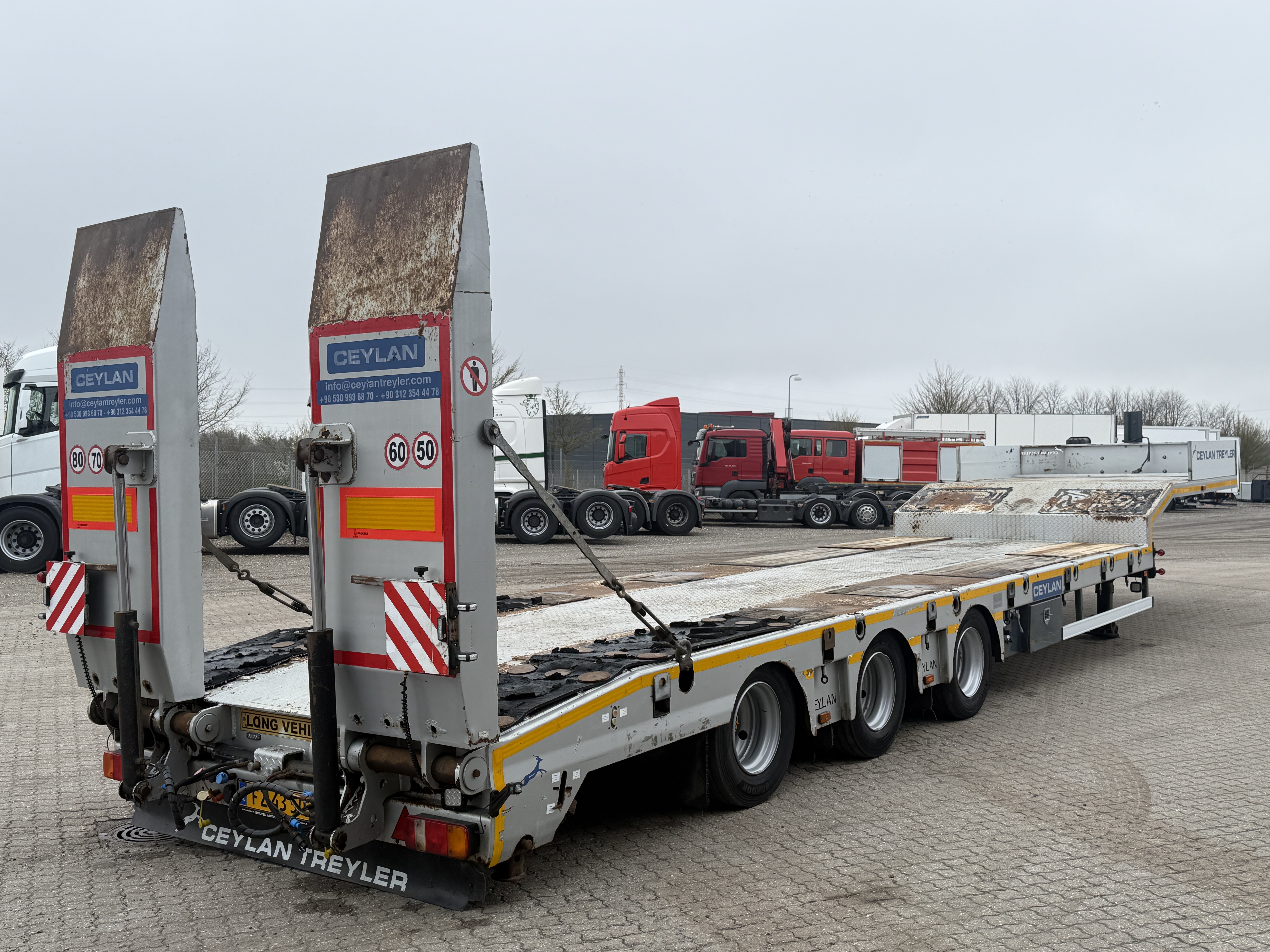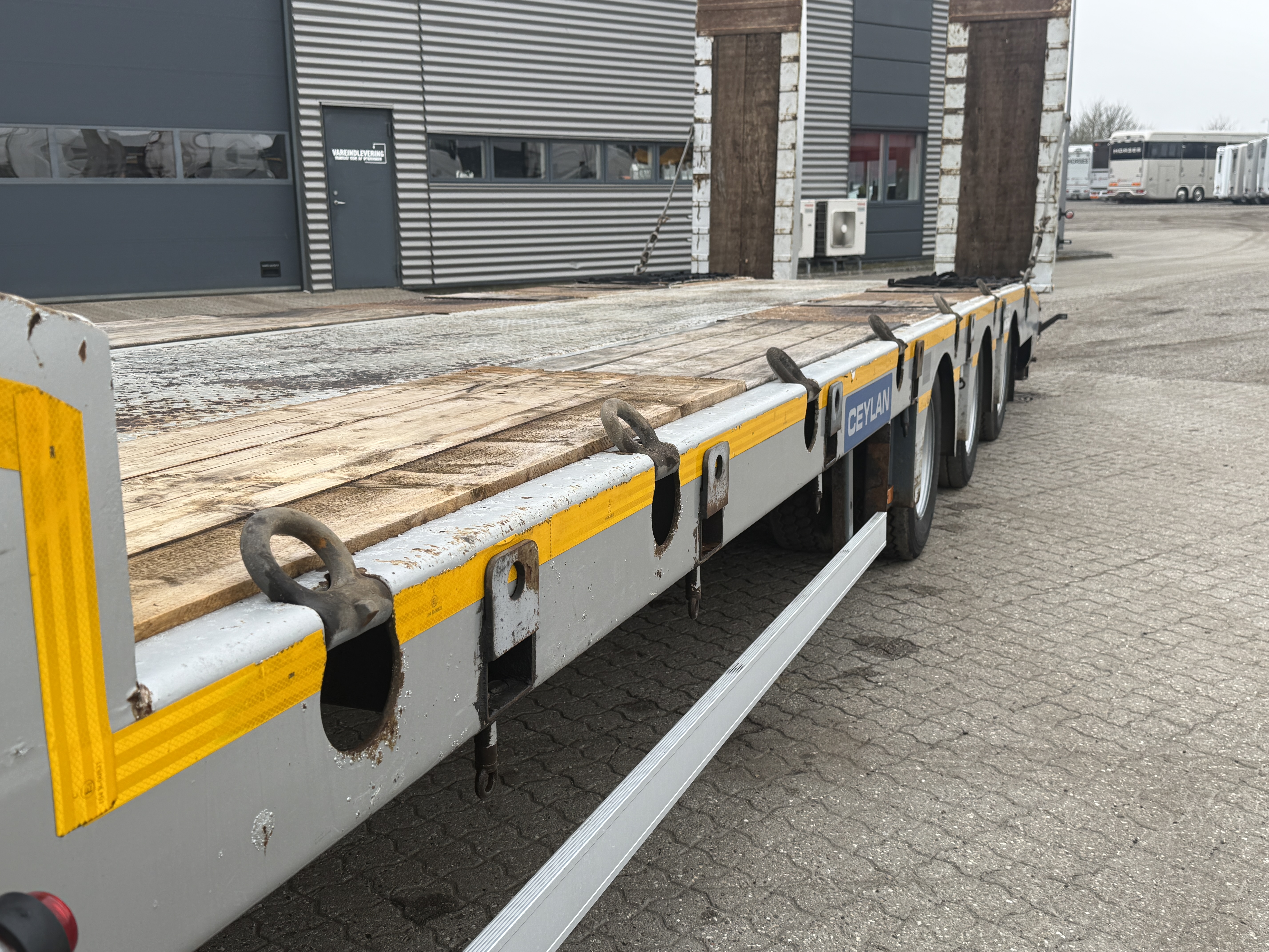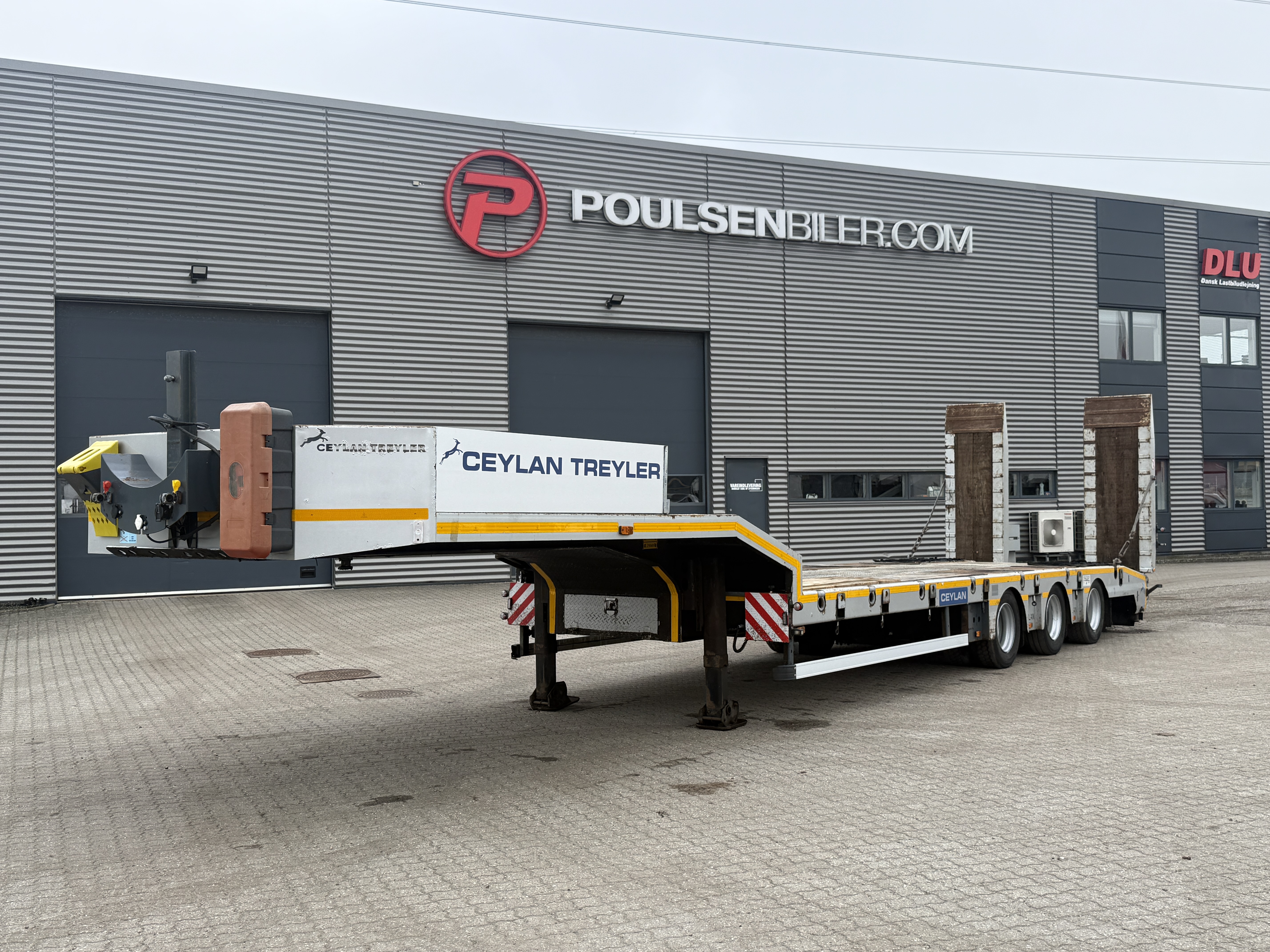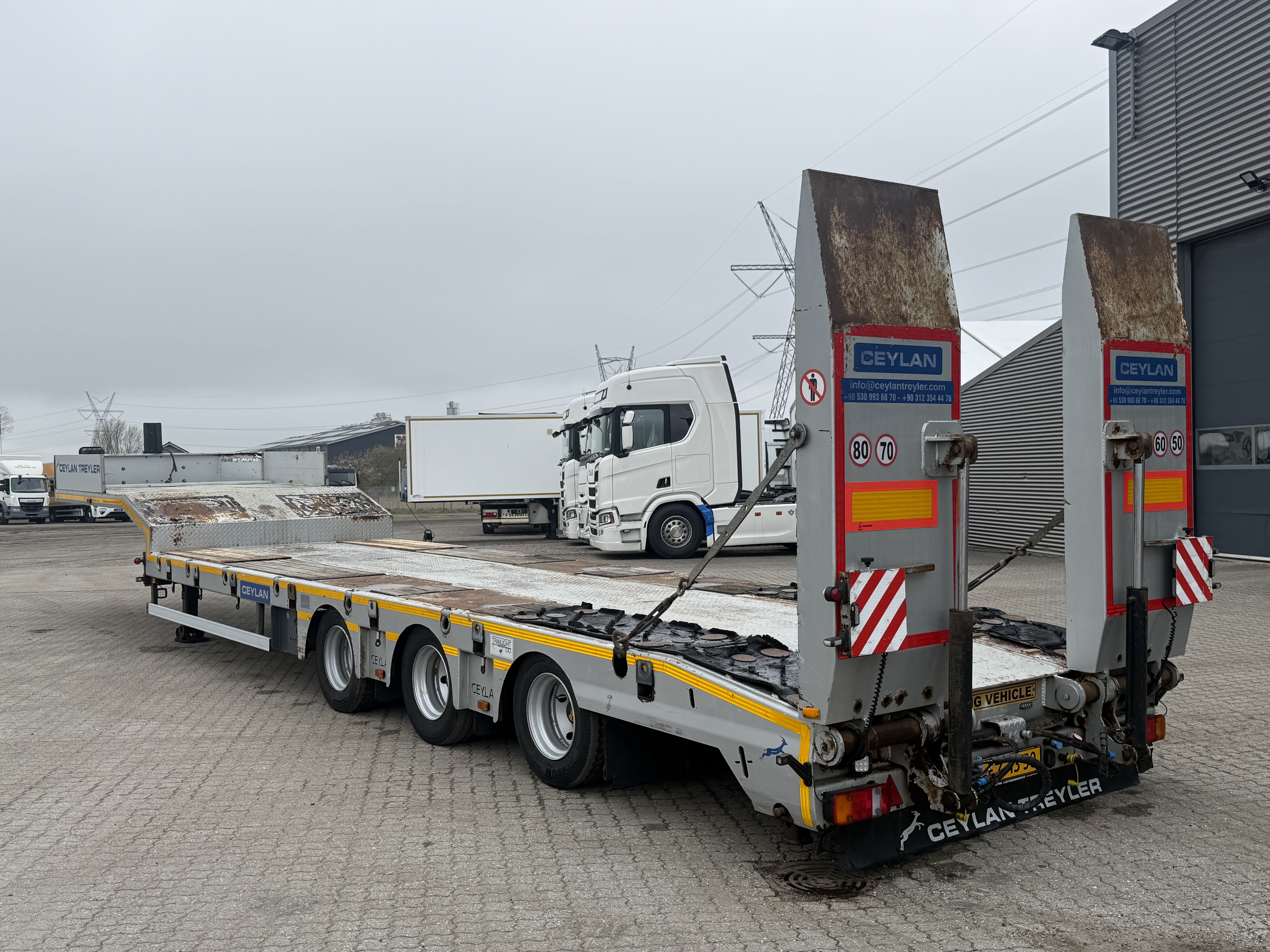 Denne Ceylan Treyler 3‑aks maskintrailer er udstyret med Trax‑aksler med tromlebremser og har hydrauliske ramper, som både kan hæves og sideforskydes hydraulisk.