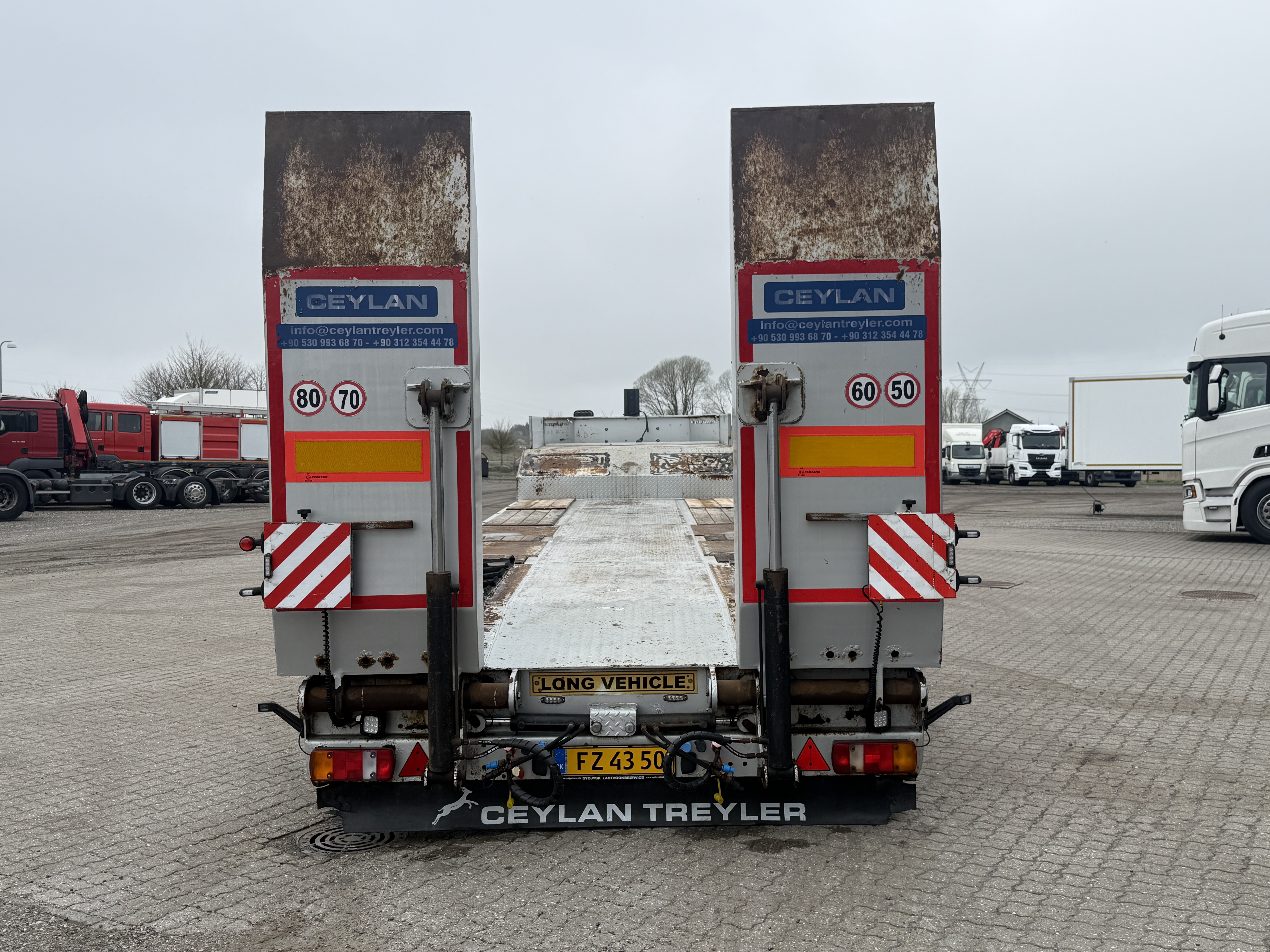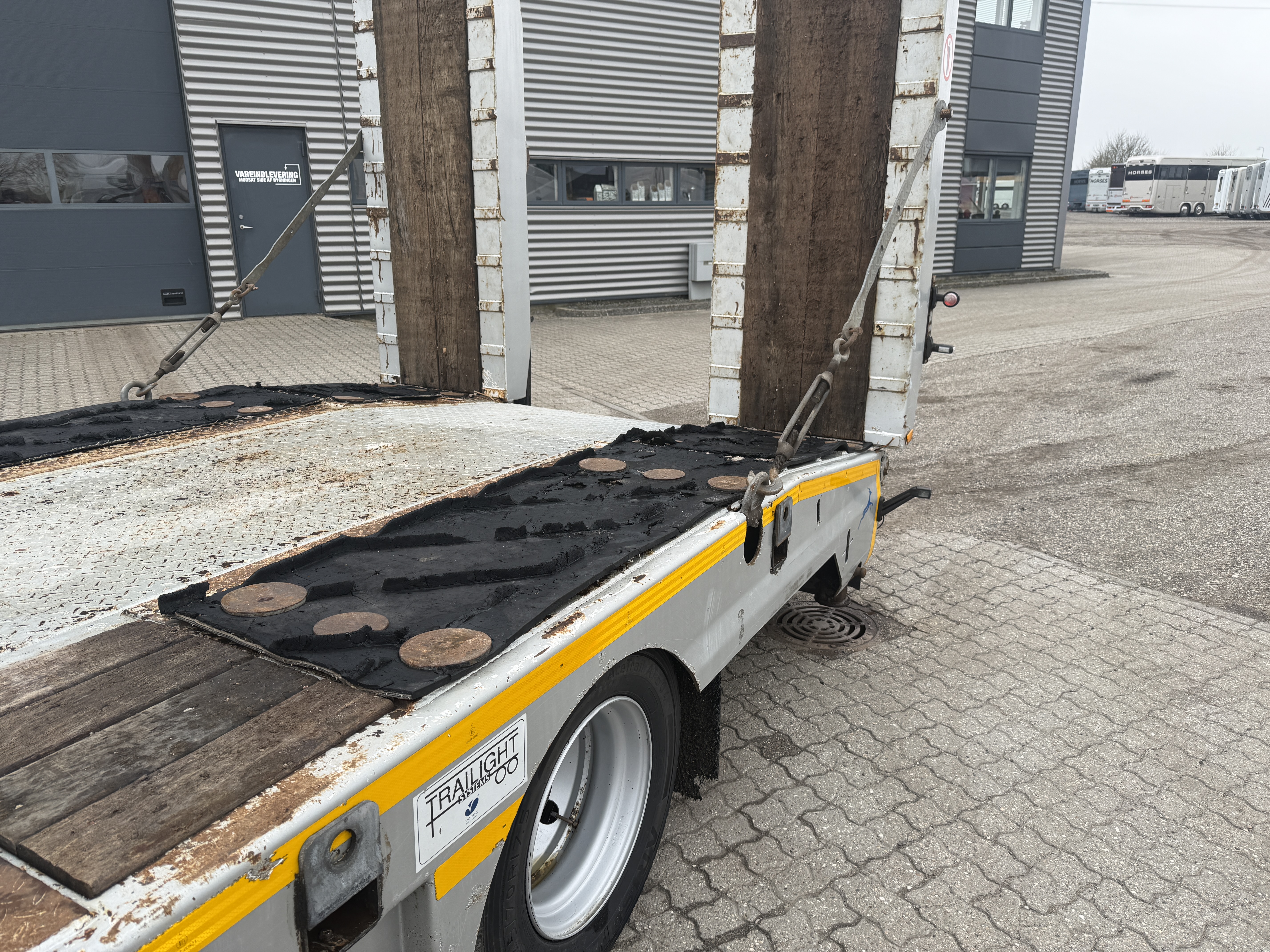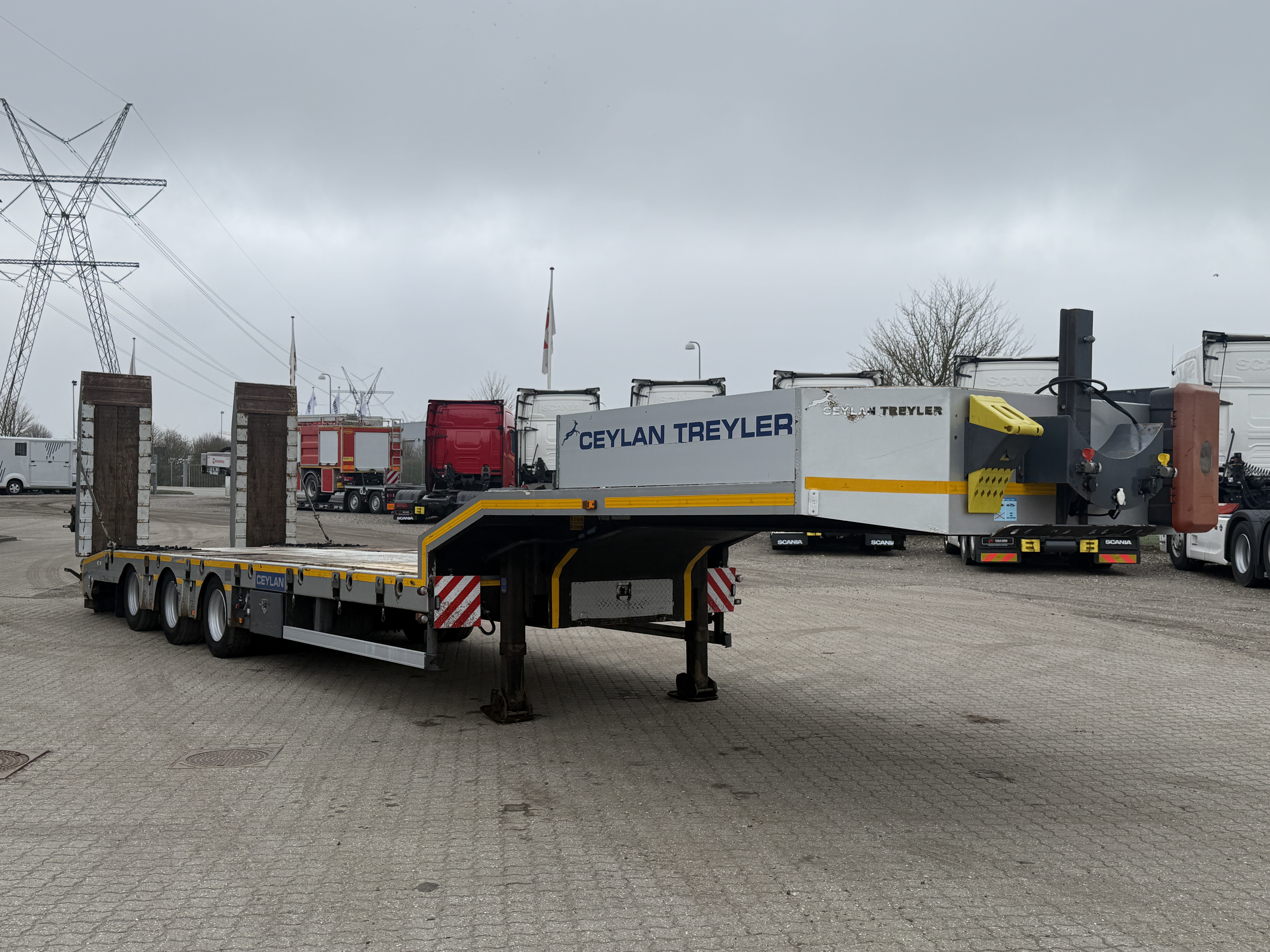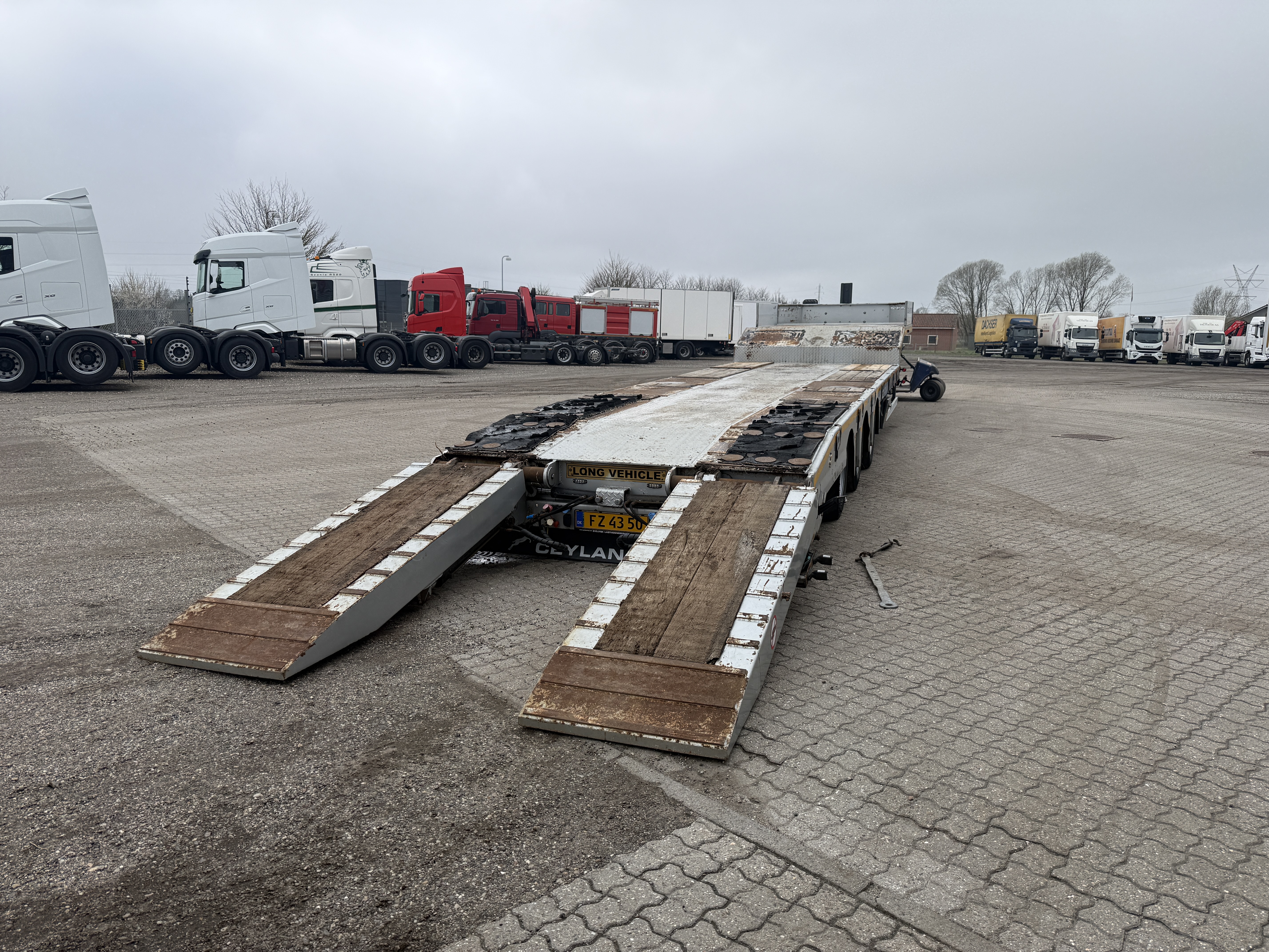 Denne Ceylan Treyler 3‑aks maskintrailer er udstyret med Trax‑aksler med tromlebremser og har hydrauliske ramper, som både kan hæves og sideforskydes hydraulisk.