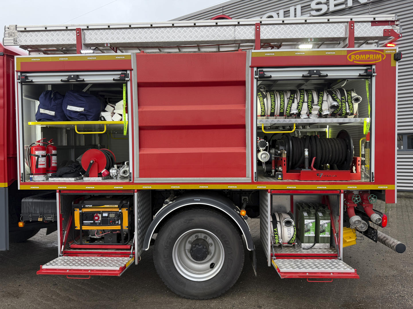 Bilen er fuldt udstyret med slanger, pumper, generator, værktøj, iltflasker m.m.