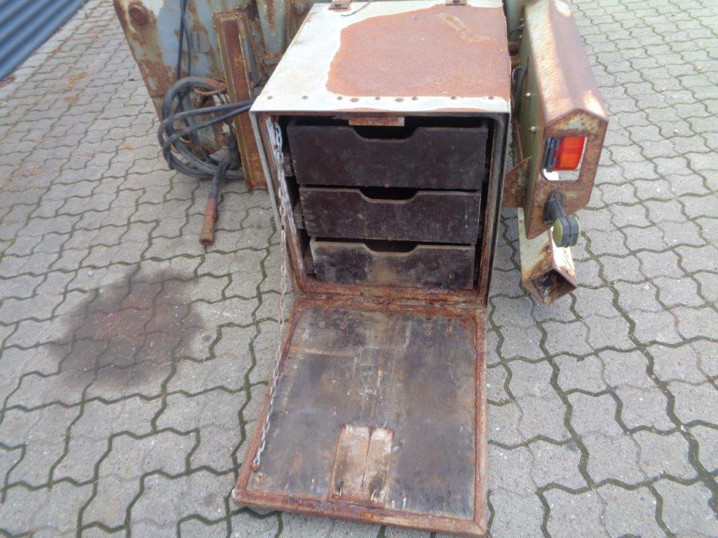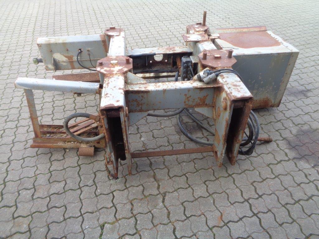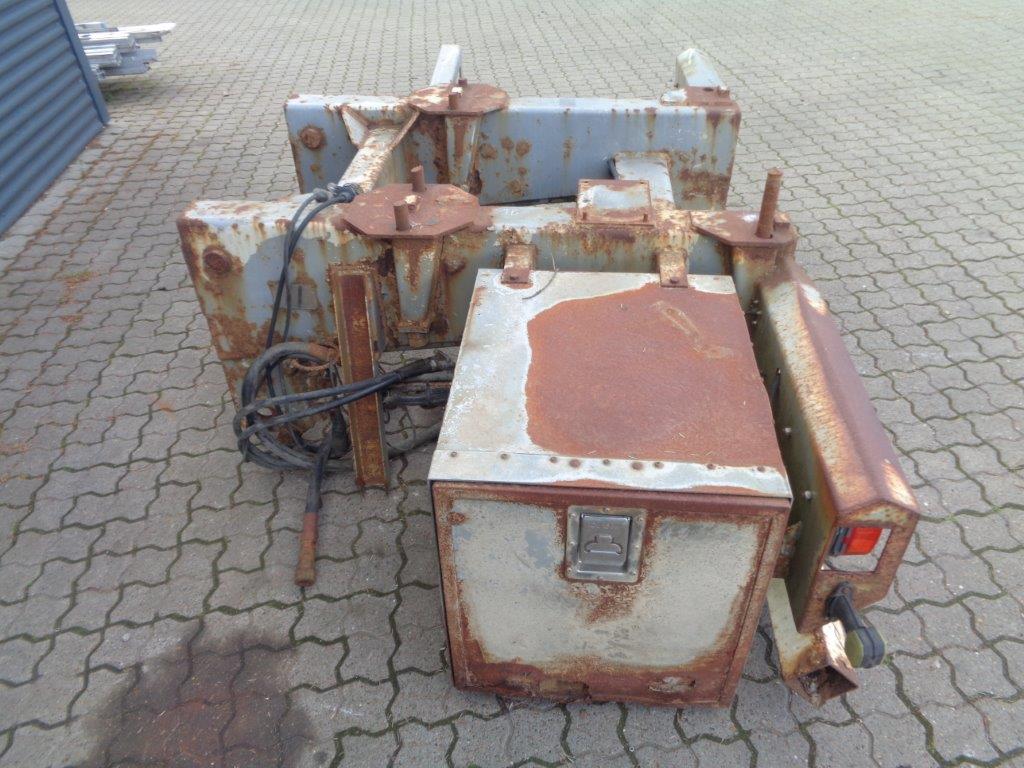 Aftagelig HMF 20 t/m krankonsol med HMF træk travers med D værdi - 190 kN - V -værdi 70 kN iht. HMF teknisk dokumentation - lys, luft og olie trukket med bagud - støttebens pladeophæng - Mål: 785 mm fra center til center mellem vanger - gaffelbredde 700mm som går ind over kran ophængs beslag - 60 mm ophængs bolte - 475mm fra nederste bolt til øverste - 1350 mm langt. - skurvognstræk - baglygter - værktøjskasse - grå med hvide lygtehuse trænger til sandblæsning