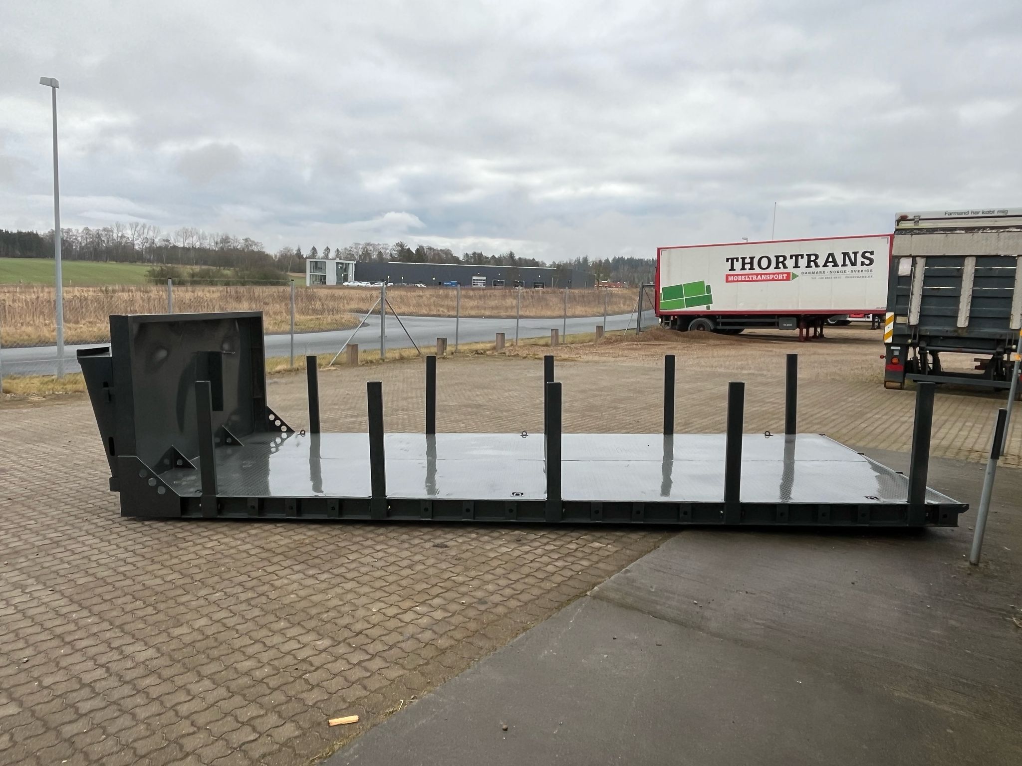 ML6000R Maskinlad til både wire og kroghejs 1450mm - indv. B:2550 L:6000 mm - surrings ringe i bunden af lad - med 2 stk opkørselsramper - 5 stk kæpstokke i hver side - Sortgrå RAL 7021 - Vi har også et lad på længder 6200 mm og 6500 mm indvendig længde på vej.