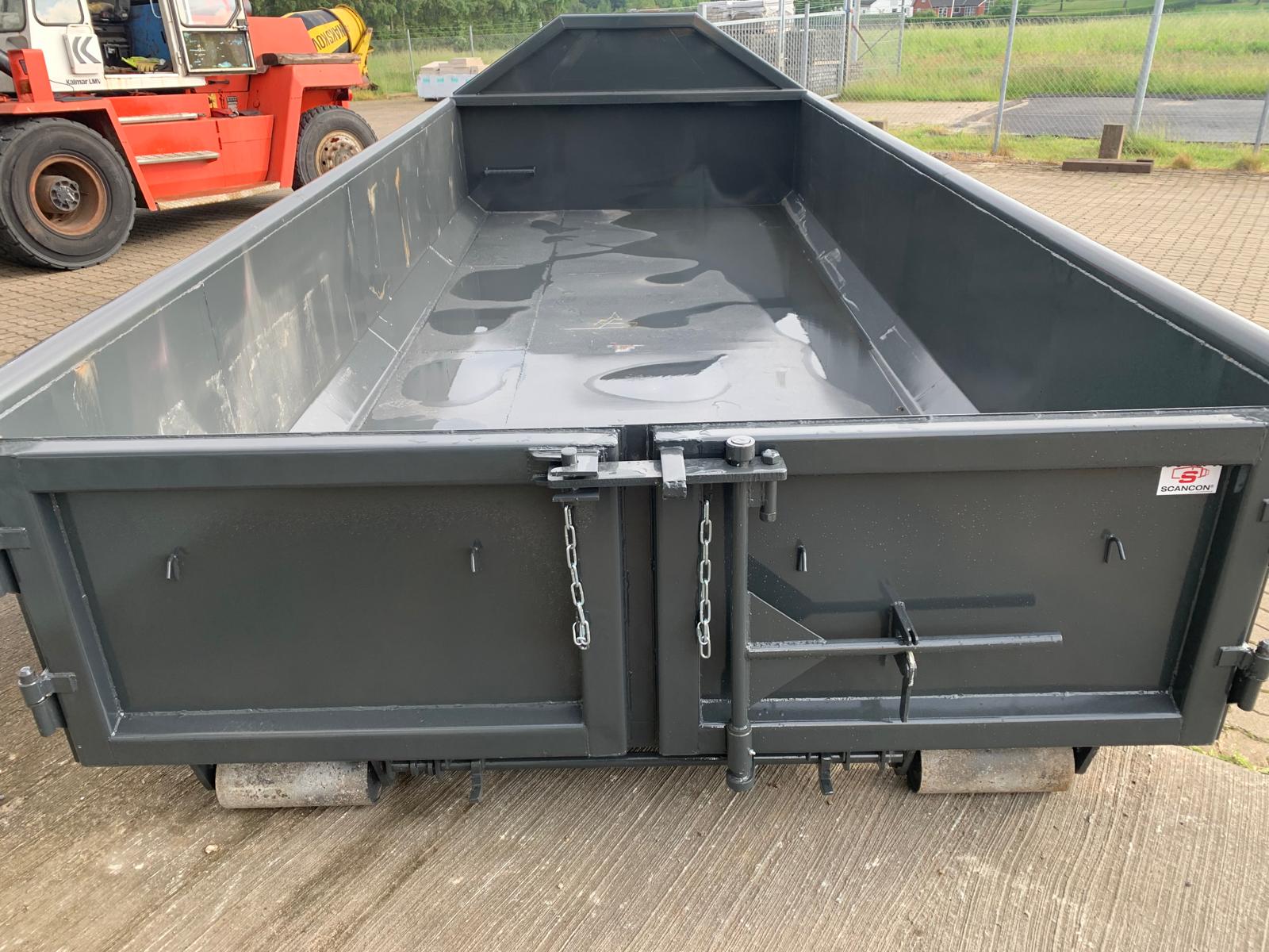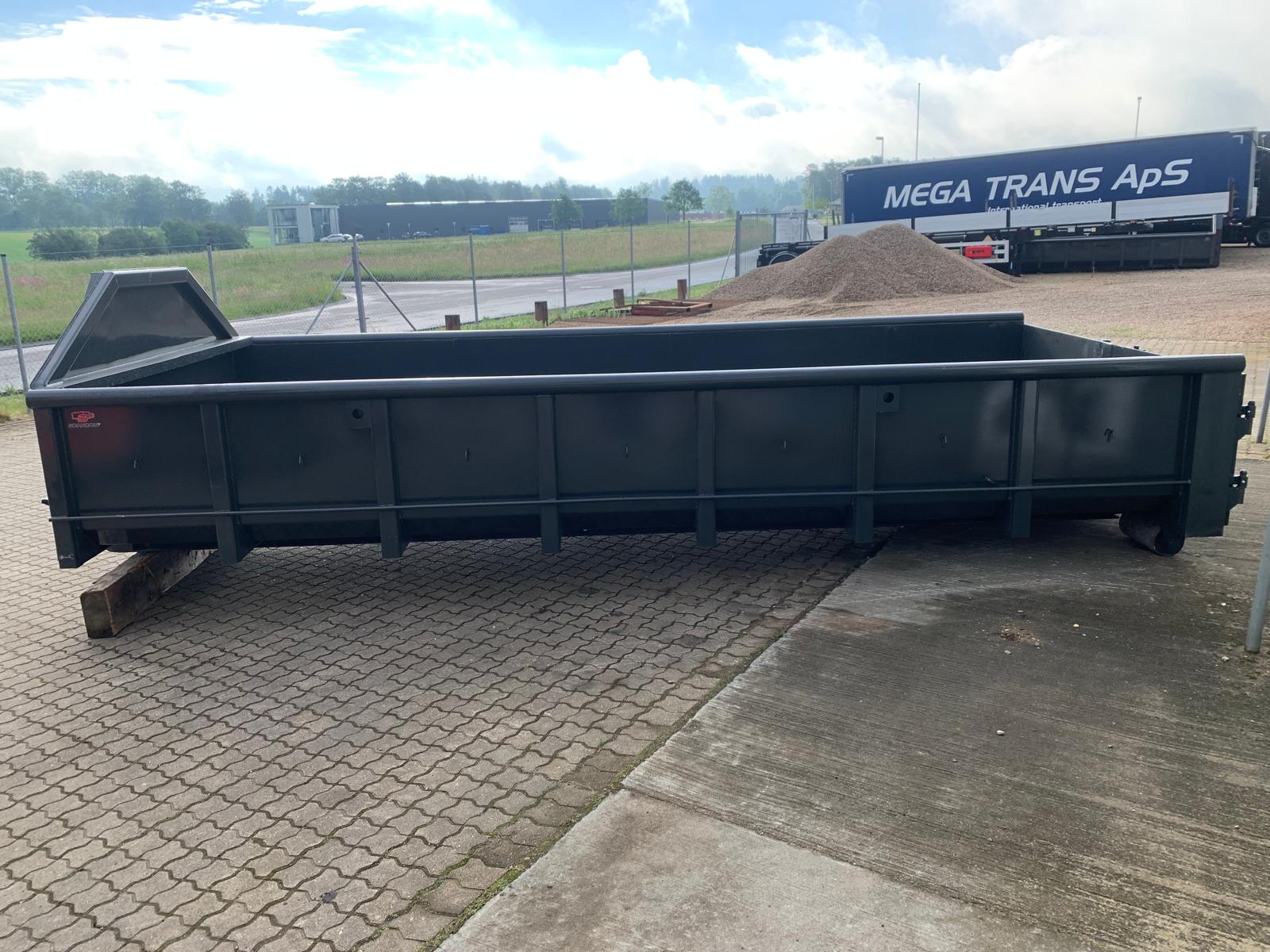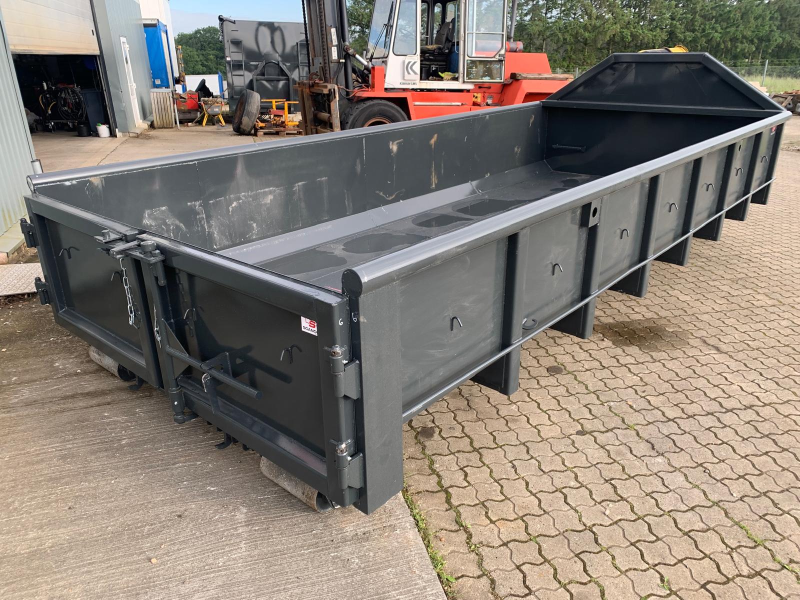 indv. mål 5500 x H 800 x B 2350 mm - 5 mm. bund og 3 mm i sider - optræk tårn til krog og wire hejs - Sidehængt bagdøre - rumindhold 10m3 - lakeret i RAL 3001 signalrød (Farve kan ændres frem til 2 uger før levering) - 750 mm. i vange afstand - 1849 kg egenvægt - Surrings stang lang yderside - fodtrin på forsmæk + 1 stk indv. i kassen