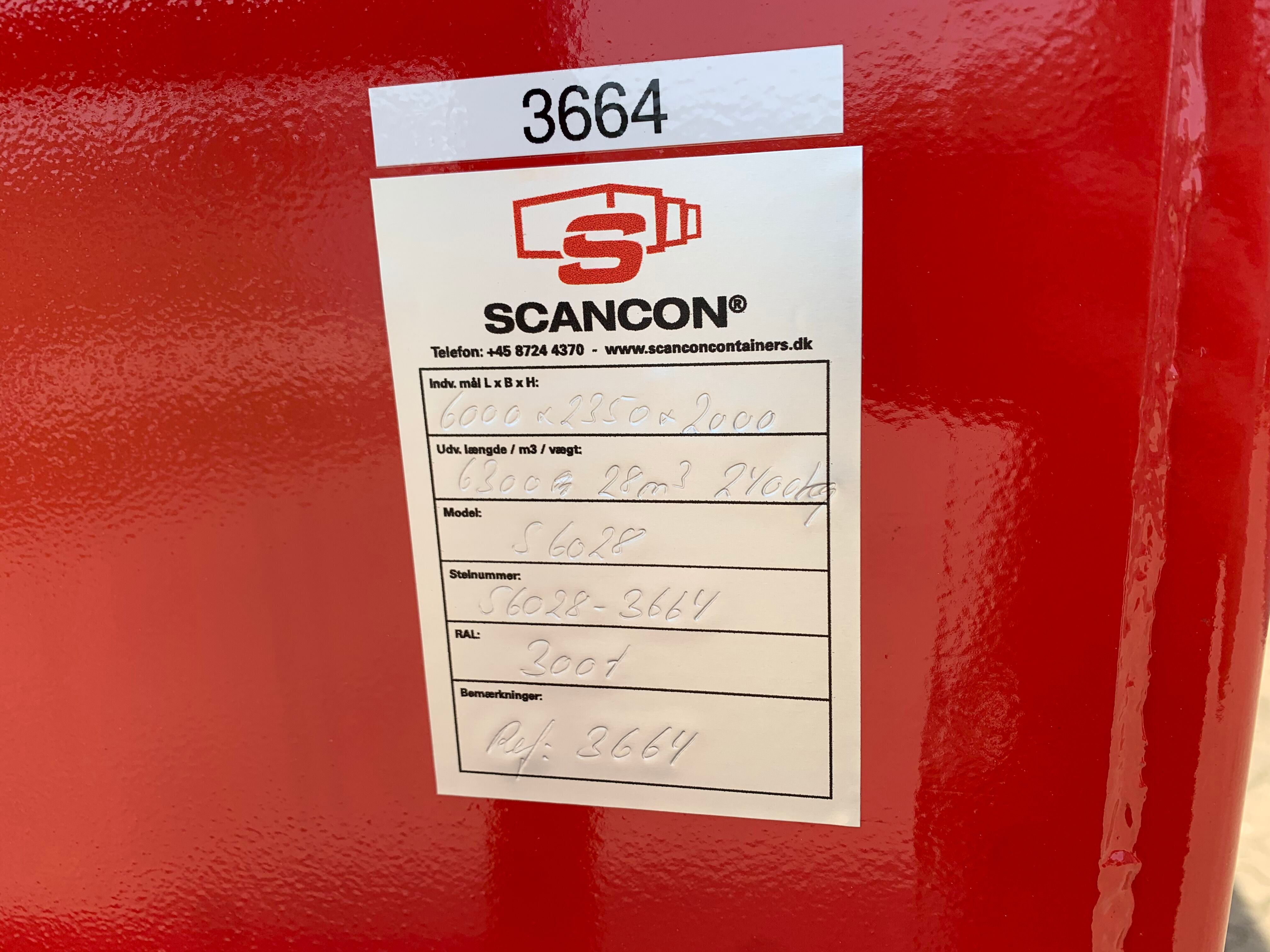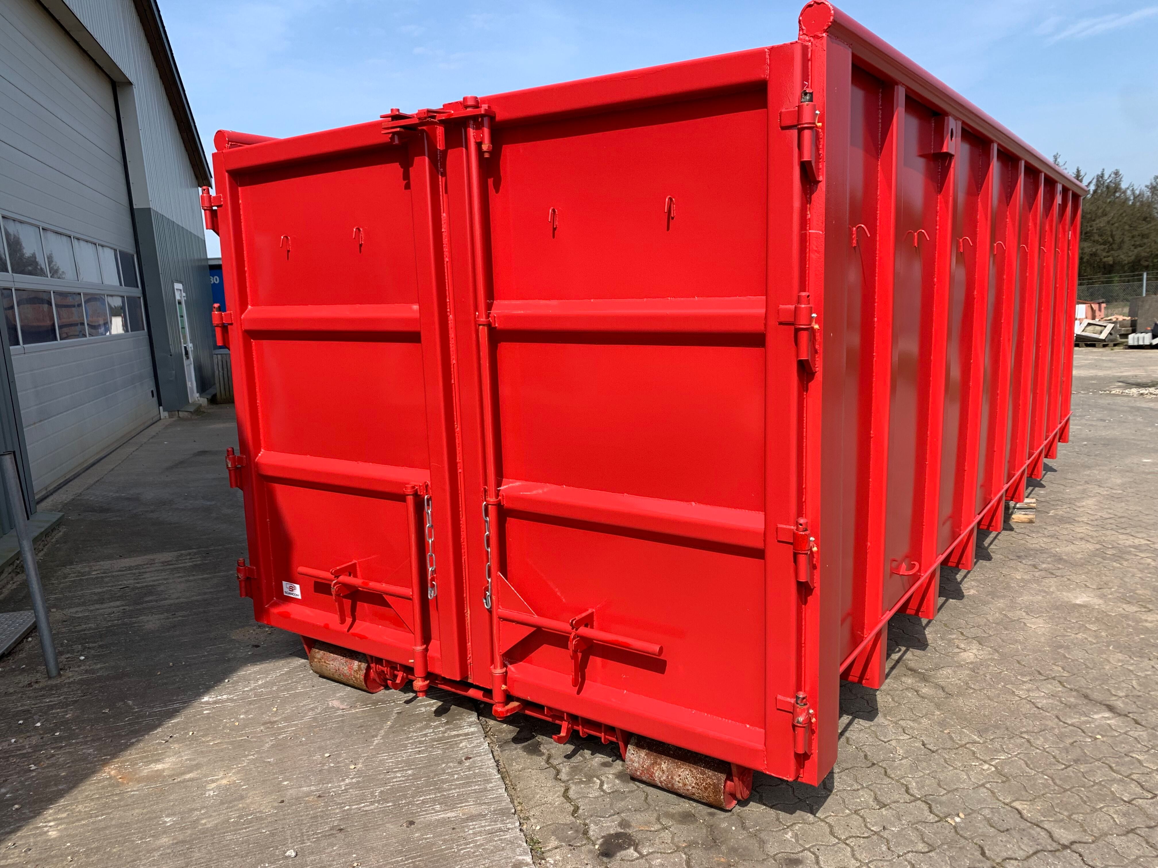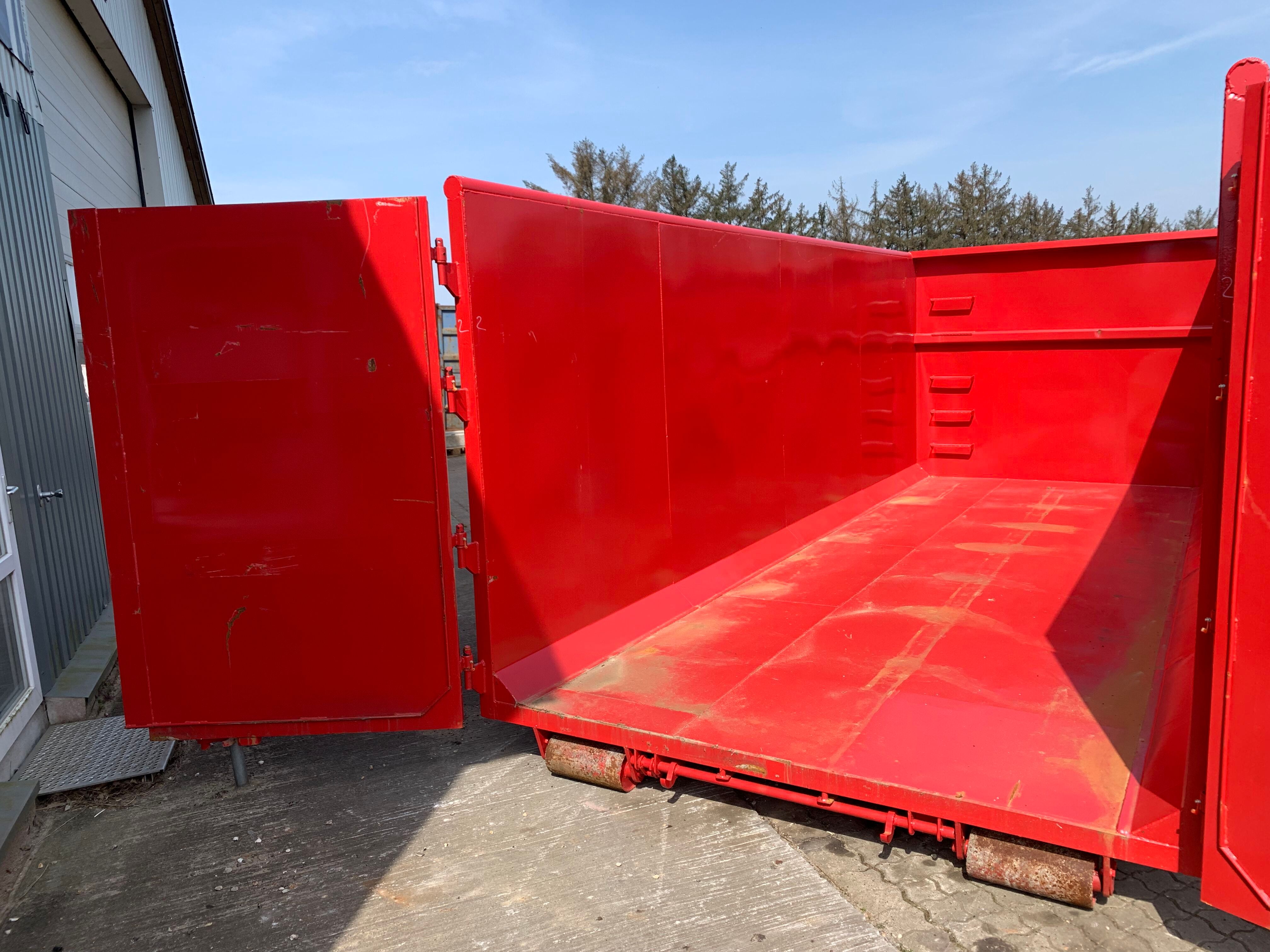 H:2000 mm x B:2350 mm x L: 6000 mm - udv. længde: 6300 mm - rumindhold 28m3 - 5 mm. bund og 3 mm. sider - optræks tårn til krog og wire hejs - Sidehængt bagdøre - Lakeret i RAL 3001 signalrød (Farve kan ændres frem til 2 uger før levering) - 750 mm. i vange afstand - kraftig surrings stang lang yderside - fodtrin på forsmæk ind- og udvendig.