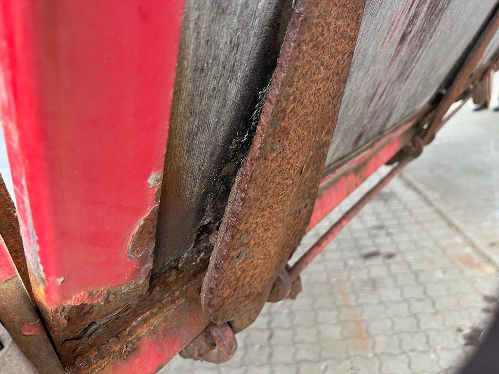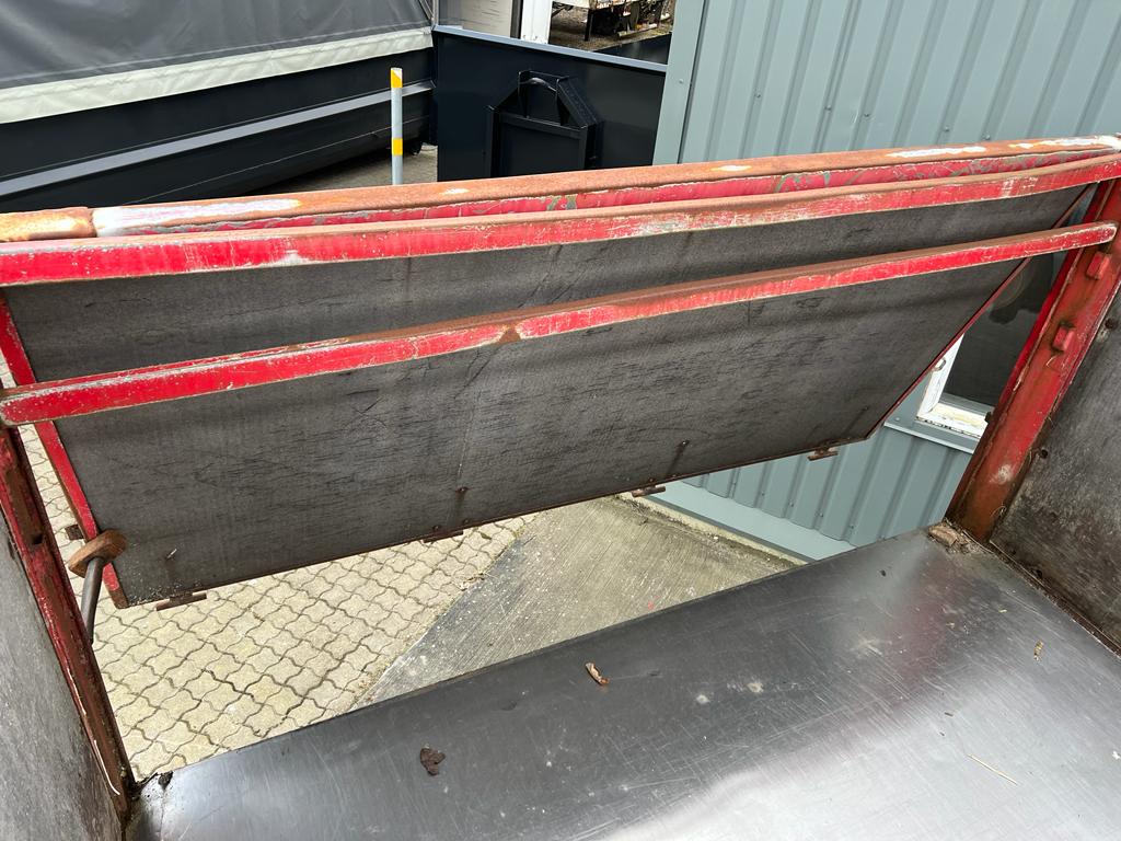 Opbygget med følgende indv. mål: L6190 x B2440 x H1240 mm (Totallængde ca. 6350. mm alt inkl.) - Top/bundhængte finersider + bagsmæk - Optræk for krog + Wirehejs - Midterrulle - Rød